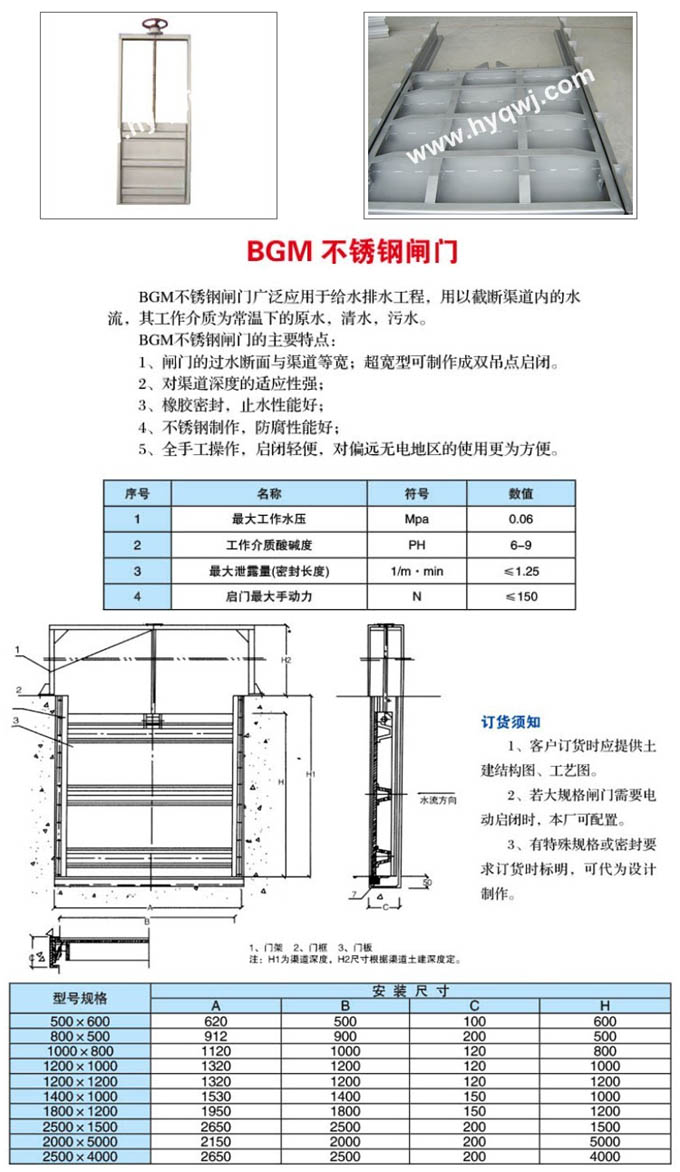 BGM不銹鋼閘門廣泛應(yīng)用于給排水工程,用以截斷渠道內(nèi)的水流,其工作介質(zhì)為常溫下的原水、清水、污水。